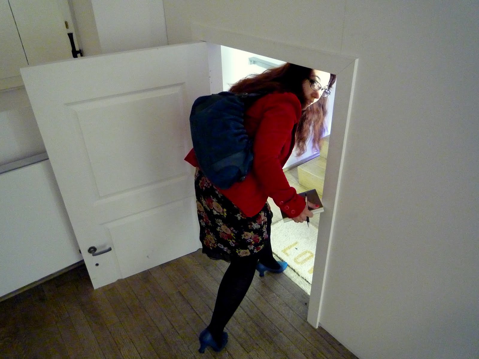 Après avoir avalé un truc vite fait dans un snack, nous sommes arrivés au Musée de la Mode. Dès le hall d’entrée, l’expo semblait très prometteuse, pleine de modèles originaux et délirants. Ma première impression s’est rapidement confirmée. Nous avons pu admirer un grand nombre de chaussures improbables ou qui nous ont fait nous exclamer, Miss Sunalee et moi: « Oh, celles-là je les porterais volontiers! ». Toutes les époques étaient couvertes depuis le début du vingtième siècle, et quantité de designers belges ou autres étaient représentés avec leurs créations les plus frappantes. La scénographie permettait d’admirer chaque pièce à loisir sous tous les angles, et pour une fois, les photos étaient autorisées, youpi! Mais ce qui m’a surtout frappée, c’est la beauté du bâtiment et la façon astucieuse dont il a été aménagé, avec de vraies trouvailles comme les passerelles aériennes, la grande porte en biais ou la porte minuscule façon « Alice au pays des merveilles ». En fait, je n’ai qu’un seul reproche à faire à « In her shoes », c’est l’absence d’explications ou de commentaires dans une langue autre que le flamoutchi. A part ça, j’ai énormément aimé, et malgré la durée du trajet, je reviendrai très volontiers au Modemuseum pour une prochain expo.