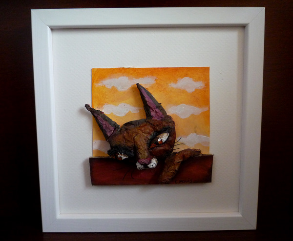 Cathy Mouis qui le retient finalement. Je possède déjà un assez grand tableau d’elle représentant deux chats en papier mâché; intitulé « Caramel et Chocolat », il trône fièrement à l’abri de la bibliothèque de Monpatelin. Son petit frère me fait de l’oeil, et je me dis que dans un cadre blanc, il rendrait fort bien sur le mur marron de notre salon bruxellois.