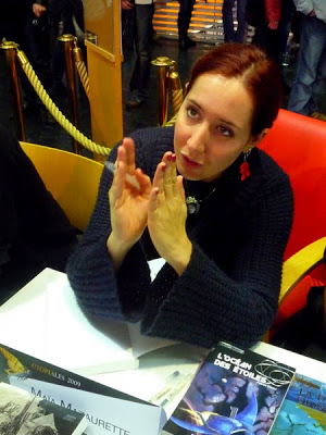 Non, la sexblogueuse la plus célèbre de France (même si elle est désormais domiciliée à Berlin) n’était pas en train de me parler calibre pénien mais chaussures. Et ouais! Quand deux filles qui partagent une même passion se rencontrent, ça donne une conversation fort sympathique sur la cambrure idéale des escarpins à talon très haut et les prix « relativement modiques » – je cite – pratiqués par la marque Buffalo, celle des fameuses babies rouges qui me font baver d’envie chaque fois que Maïa Mazaurette poste une photo d’elle avec. En dédicace sur mon exemplaire de « Rien ne nous survivra – Le pire est avenir« , elle m’a dessiné un plan d’accès à la boutique berlinoise, au cas où mes déambulations shoppinguesques et culturelles m’emmèneraient là-bas un de ces jours. J’avais d’elle l’image d’une fille très naturelle plutôt que sulfureuse, et je ne m’étais pas trompée: Maïa est souriante, spontanée et hyper accessible. En plus, elle portait des boucles d’oreilles Goldorak en plastique rose fluo absolument terribles. J’ai beaucoup aimé le petit moment passé à discuter avec elle aux Utopiales samedi après-midi.