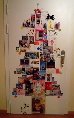 Bricolé vite fait hier soir avec tous les trucs qui traînaient derrière notre porte d’entrée: photos de voyage, photos où nous faisons les pitres, photos de famille, carte de voeux de l’an dernier, billets de spectacle vus récemment, tickets d’entrée de musée, jolis flyers, articles ou pubs découpés dans des journaux, cartes de restos ou d’hôtels, calligraphies arabes, magnets de toutes sortes… et en guise d’étoile, un maneki-neko porte-bonheur en tissu.