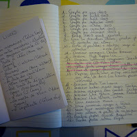 – Un plus grand, ligné et illustré d’une toile de Magritte, offert par Kris et Céline lors de leur dernière visite à Bruxelles. En commençant par le début, on y trouve mon « ongoing to-do list », c’est-à-dire les choses que je veux ou dois faire mais pour lesquelles je n’ai pas de deadline précise; chaque tâche accomplie est ensuite barrée au stylo-gel rose fluo. Et à la fin, j’ai décidé de noter les rentrées d’argent dues à mes différentes (re)ventes sur eBay ou Amazon Marketplace: ça correspondra à la somme que je peux dépenser en chaussures ou autres plaisirs pas indispensables.