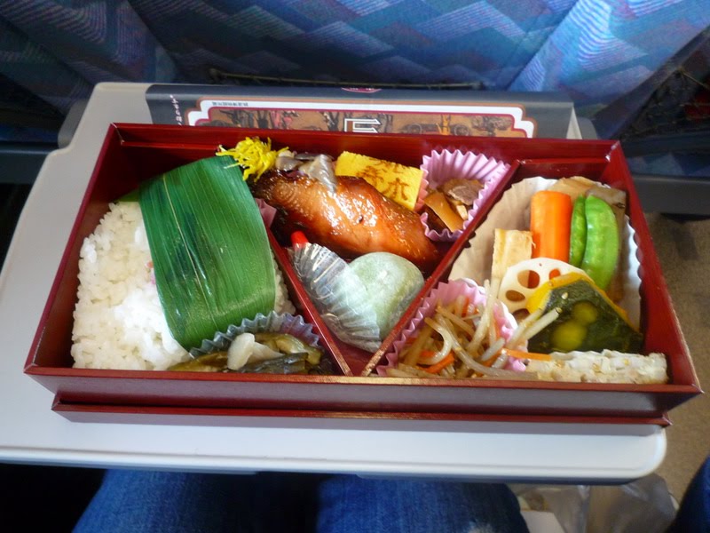 – Les bentos: plateaux-repas souvent très joliment préparés, pratiques à manger dans le train ou dans la salle commune d’un ryokan, et commençant aux alentours de 400 yens (3€ environ). Celui de la photo ci-contre est au saumon; il a coûté 1200 yens, soit un peu moins de 10€. Pour dîner sur le pouce, c’est quand même vachement plus sympa qu’un McDo, non?