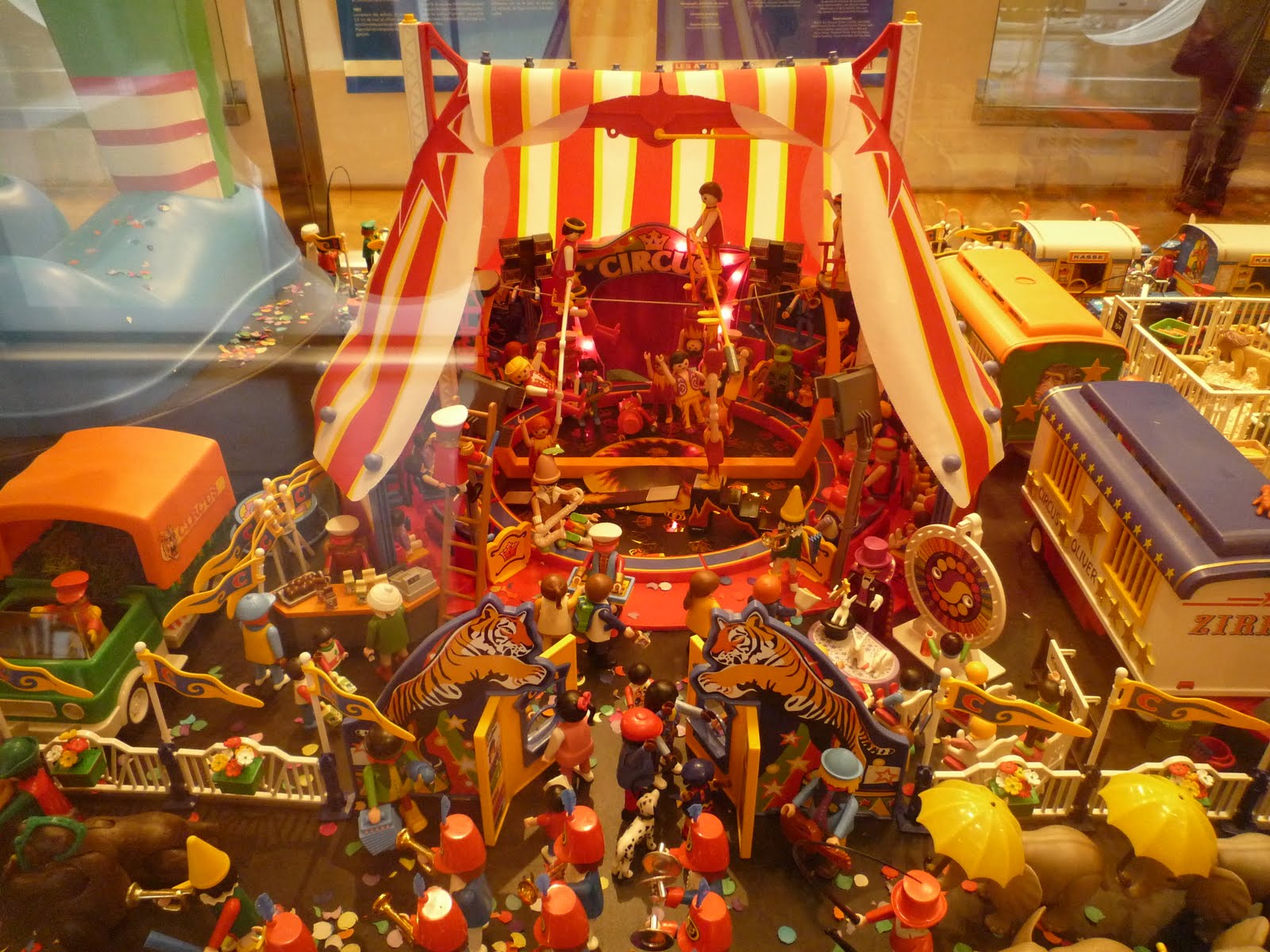 Que dire de cette expo? Euh… Il y avait beaucoup, beaucoup de Playmobil. La collec’ complète, ou pas loin. Par chance, elle était rassemblée dans d’immenses vitrines devant lesquelles il était possible de passer assez rapidement, et elle n’occupait que deux salles plus un coin vidéo. Du coup, il ne nous a pas fallu plus de dix minutes pour en faire le tour. Ce qui, à 9€ le billet, me paraît quand même un peu chérot. Mais pour ce prix-là, nous avons pu faire toutes les photos que nous voulions sans que personne de plus d’un mètre vingt vienne nous embêter. J’étais ravie, je vous raconte même pas.