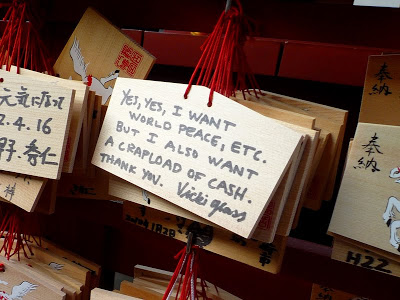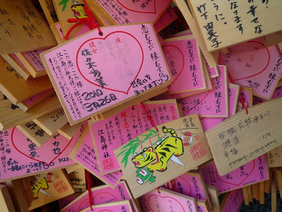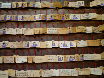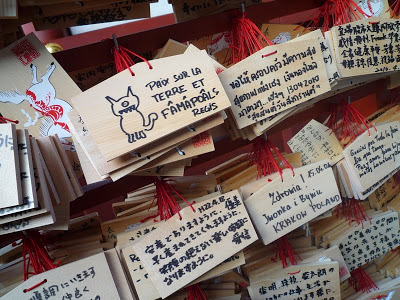La plupart des visiteurs réclament la santé et le bonheur pour leurs proches; d’autres, plus ambitieux, souhaitent la paix dans le monde. On trouve parfois des messages très émouvants, comme hier après-midi sur l’île d’Enoshima: « 6 milliards d’humains sur Terre et tu es celui que je préfère. Ton papa qui t’aime » ou encore au temple de Kannon à Hase: « Je suis passée par ici, c’était beau, je me sentais bien et j’ai pensé à toi. Où que tu sois, j’espère que tu as trouvé la sérénité ». Certain(e)s se montrent plus pragmatiques: