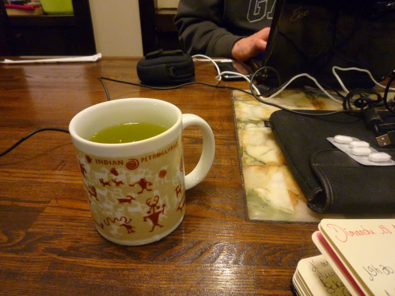 La vaisselle n’étant pas fournie, j’ai pris l’habitude à chacun de mes séjours d’emporter un mug pabô que j’abandonne sur place à la fin, histoire de faire de la place dans la valise. Et cette fois, j’ai eu la surprise de retrouver celui que j’avais laissé ici en septembre 2007 – un mug acheté dans l’Arizona pour $1 ou 2 lors d’un road trip avec les VIP, et dont je m’étais lassée.