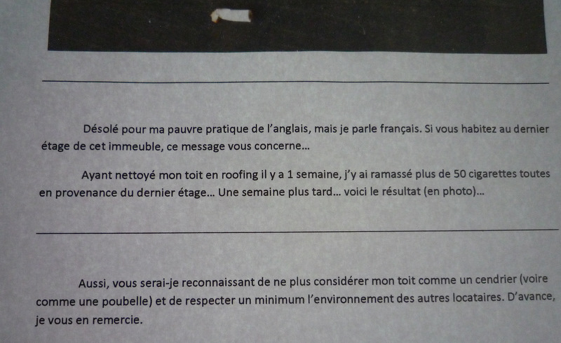 Trouvé ce midi, en descendant chercher le courrier, ce mot scotché sur la porte d’entrée de l’immeuble et signé du voisin du rez-de-chaussée: