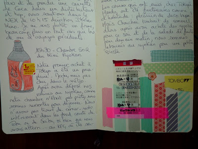J’ai utilisé un Moleskine ordinaire, dont j’ai décoré la couverture avec du deco tape rose, une étiquette prélevée sur un emballage du Musée Ghibli, une carte postale achetée chez Ito-Ya et une étiquette postale. Carnet mythique ou pas, je crois que je trouverai un autre support pour immortaliser mon prochain voyage: le papier trop lisse ne prend pas du tout l’aquarelle, et je le trouve trop épais pour qu’il soit agréable d’écrire dessus. En outre, dès qu’on commence à coller des choses sur les pages, la reliure ne suit pas, et on se retrouve avec un carnet tout boursouflé qui menace de dégueuler son contenu.