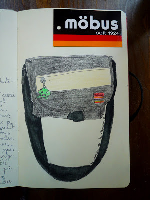 La super-sacoche dénichée par Chouchou chez Loft. Belle, solide, pratique: depuis notre retour en Belgique, on lui a déjà demandé plusieurs fois où il l’avait achetée. J’ai fait ce dessin dans le Shinkansen qui nous ramenait de Kyoto, et je le préférais pas colorié.