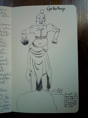 Dans les temples, au moins, on trouve toujours un endroit où s’asseoir… Comme je l’ai noté dans un coin de la page, cette statue avait l’air beaucoup plus diabolique en vrai; on aurait dit un méchant génie. Ce qui ne perturbait absolument pas le matou blanc et roux qui somnolait à ses pieds.