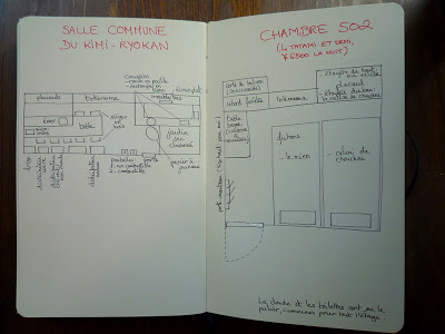 Quand on s’ennuie un peu pendant la soirée, pourquoi ne pas s’amuser à dresser le plan du lieu où l’on séjourne? Ici, la salle commune de notre ryokan et la chambre que nous y occupions.