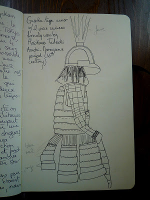 Le dessin de cette armure de samouraï du 16ème siècle, debout au milieu du flot des visiteurs du Tokyo National Museum, reste un exploit dont je ne suis pas peu fière même s’il m’a été impossible de le mettre en couleur sur place (et que j’ai eu la flemme de le faire plus tard, bien qu’ayant pris note des couleurs des différentes parties).