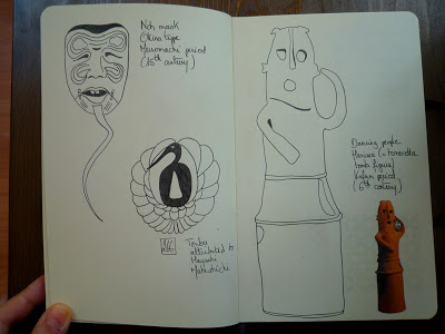 Toujours au Tokyo National Museum, quelques dessins plus rapides: un masque de Nô, une tsuba (garde de sabre) et une haniwa (figurine mortuaire en terre cuite; celle-ci date du 6ème siècle).