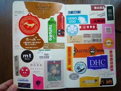 A la fin de mon Moleskine, j’ai réalisé ce collage avec les petits morceaux de scotch dont les vendeurs japonais se servent pour fermer les sacs de shopping et qui sont personnalisés en fonction de chaque magasin. La preuve qu’on peut faire un carnet de voyage même sans savoir dessiner: il suffit de récupérer de petites choses à droite et à gauche!
