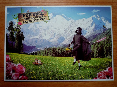 N’empêche que si on le pratique intensivement, Postcrossing n’est pas un loisir économique. En Belgique, les timbres pour envoyer une carte postale dans un autre pays d’Europe coûtent 0,90€, et les timbres pour envoyer une carte postale dans le reste du monde, 1,05€. A cela, il faut rajouter le prix des cartes elles-mêmes (de 0,25€ pour les cartes touristiques de base à près de 2€ pour certaines cartes d’art). Mon budget n’étant pas infini, je me suis donc mise à fouiller les présentoirs de cartes postales publicitaires qui fleurissent un peu partout dans les cinémas, les bars et les restaurants de Bruxelles. Parfois, on y trouve des choses très drôles, au point que j’en rafle quelques exemplaires pour envoyer et en prends aussi un pour moi. Quelques exemples parmi mes préférées: