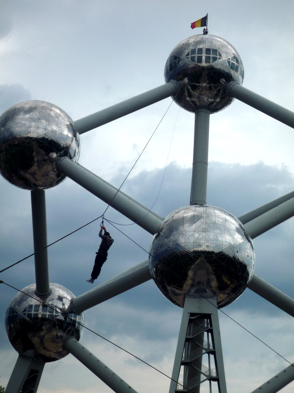 Ce n’est pas tous les jours qu’on a l’occasion de se jeter du haut du plus célèbre monument belge.Une dame a emmené six d’entre nous vers l’ascenseur qui conduit au restaurant situé dans la plus haute boule de l’Atomium. Là, nous avons monté un petit escalier métallique en colimaçon qui nous a fait déboucher dans la structure même du monument. L’espace était hyper confiné, et j’ai commencé à me sentir oppressée. Une dernière échelle qui n’en était même pas une – juste des très grandes vis faisant office d’appuis pour les pieds – et j’ai émergé à l’air libre. Devant moi, Chouchou était déjà assis de l’autre côté de la balustrade, au bord du vide. Pas le temps de réfléchir ou de paniquer: un monsieur me débitait des instructions à toute vitesse, et j’ai pensé qu’il valait mieux les écouter. Tandis que Chouchou s’éloignait le long de la double corde, je me suis mise en place à mon tour; j’ai passé mes mains dans les sangles et agrippé celles-ci au-dessus de mes poignets; je me suis allongée sur la boule et… j’ai glissé dans le vide.