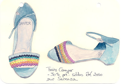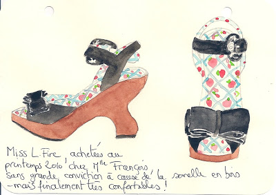Je poursuis mon carnet de portraits de chaussures avec plus ou moins d’assiduité et de réussite. Cet après-midi, par exemple, j’ai aquarellé trois esquisses et j’en ai bien bien massacré une (celle des Nerine de Chie Mihara: je n’ai pas du tout su rendre les différents tons de brun qui font le charme du modèle dans la couleur où je l’ai acheté). Par contre, malgré quelques défauts flagrants, je suis assez contente des deux paires qui suivent – et qui sont justement celles que j’aurai le plus portées cet été.