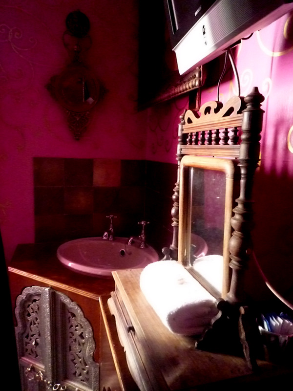 Minuscule, avec tout juste la place de se déplacer en crabe entre les meubles. Très surchargée au niveau de la déco, ce qui combiné à l’exiguïté des lieux et à la petite taille de la fenêtre donne une pièce extrêmement sombre où il n’a pas été possible de prendre des photos correctes. Lavabo situé dans un coin de la chambre, plutôt qu’à la salle de bain: pittoresque mais peu pratique. Aucun produit d’hygiène fourni, à part un minuscule savon pour les mains avec lequel nous avons également dû nous doucher. Lit à baldaquin sympathique, mais matelas dur, sur lequel nous avons pourtant très bien dormi. Réception wifi hyper-faible, à moins de se tenir derrière la porte ordinateur brandi en l’air.
