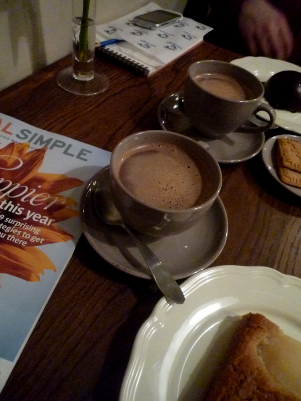 Je pense vraiment qu’à long terme, le salut ne peut venir que de moi-même et pas d’une source extérieure, que c’est à moi d’apprendre à maîtriser mes émotions et les réactions physiques qu’elles induisent. C’est cela que j’espère retirer de ma pratique du yoga, de la méditation et de la visualisation. Mais je suis consciente que les progrès vont être lents, et que je dois trouver un moyen de ne pas vivre trop mal en attendant de pouvoir me prendre en charge seule. Cette semaine, Chouchou et moi allons donc prendre rendez-vous chez un ostéopathe paraît-il extraordinaire, et il se peut aussi que j’aille voir un massothérapeute recommandé par Miss Sunalee et diane cairn. Je suis même prête à retenter l’expérience psy, mais avec un(e) comportementaliste cette fois. Et en attendant que tous ces efforts portent leurs fruits, la tactique la plus efficace que j’ai trouvée pour tenir l’angoisse à distance, c’est de m’occuper un maximum, de préférence avec des choses que j’aime et qui me font plaisir. Le chocolat chaud + moelleux poire-châtaigne dégusté cet après-midi à l’Arrière-Cuisine en feuilletant le dernier numéro de Real Simple? Non, c’est pas de la gourmandise ni de la paresse: c’est de la médecine!