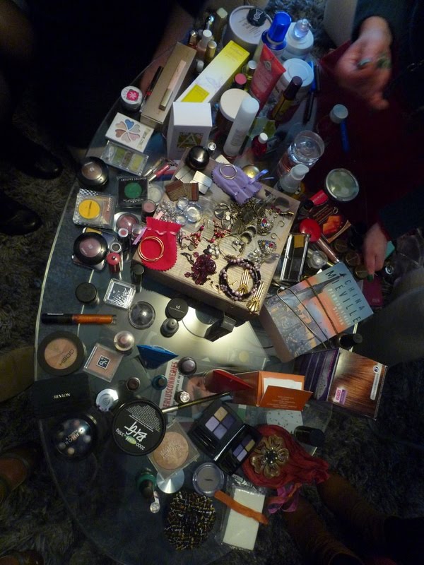 Nous commençons par boire un thé offert par la maîtresse de maison en grignotant les sublimes chouquettes apportées par La Princesse et les délicieux sablés au chocolat maison préparés par Ness. Même si toutes les filles ne se connaissent pas entre elles, les langues se délient très vite! Une fois les gourmandises sucrées débarrassées, nous étalons sur la table produits de soin et de maquillage, ainsi qu’un sympathique assortiment de bijoux. Je vois passer plusieurs paires de chouettes boucles d’oreille que je ne peux malheureusement pas adopter puisque mes perçages se sont refermés depuis belle lurette. Je récupère par contre un joli collier made by La Princesse, un vernis Essie rose ultra-pâle, un masque capillaire Loréal Fiberceutic et une bougie parfumée mandarine-cassis.