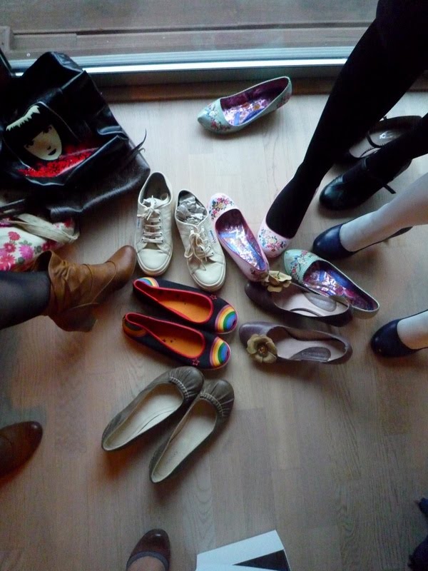 Place au salé! Miss Sunalee s’affaire en cuisine pour nous préparer des Cosmopolitan que nous dégustons avec les petits feuilletés salés apportés par Sara. Les conversations vont bon train et en discutant boulot, nous nous rendons compte que la plupart d’entre nous bossent dans le secteur culturel. Je découvre avec surprise que Nelly est à l’origine de notre participation à une émission sur Plug TV, fin 2009. La dernière goutte de breuvage rose avalée, nous passons au plat de résistance: les fringues, chaussures et autres accessoires. Très vite, la chambre de Gridou se transforme en vestiaire collectif plein de filles en collants et en sous-vêtements qui enfilent robes, jupes et petits tops à toute allure avant de courir se regarder dans le miroir en pied du couloir. « Héééé, ça te va super bien! » est l’exclamation qui revient le plus souvent. Beaucoup des pièces mal-aimées (ou mal-portées) par leur propriétaire originelle trouvent rapidement preneuse.