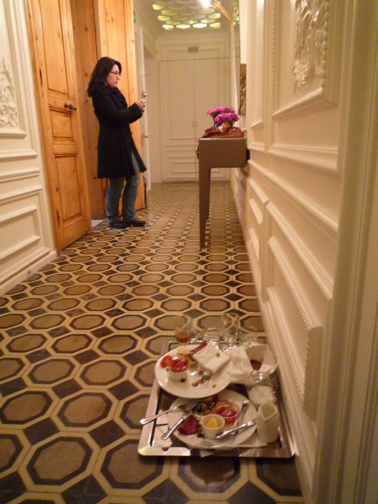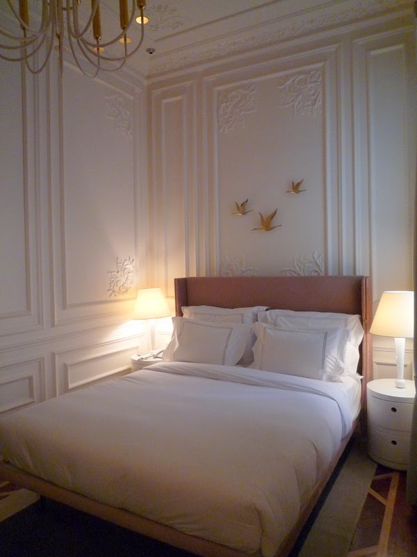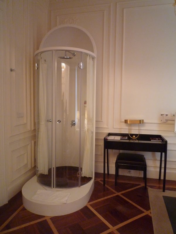 – La déco de la suite, pas vraiment design mais assez inspirée dans le genre sobre et de bon goût: oiseaux en métal doré aux murs, cabine de douche-fusée dans la chambre, plaques d’immeuble en marbre dans la salle de bain… Le reste de l’hôtel était tout aussi chouette, avec des vases de fleurs fraîches sur les consoles des couloirs, de la moquette dans les escaliers et d’immenses canapés Chesterfield dans la salle à manger.