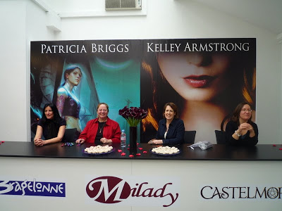 Les portes se sont ouvertes, et les fans ont commencé à rentrer. Nombreux, très nombreux, mais disciplinés et patients, ils ont formé deux files pour attendre sagement leur tour. Lorène, la traductrice de Patricia, et Isabelle, qui a récemment repris la série pour adultes de Kelley, assistaient les auteures pour dialoguer avec leurs lecteurs (qui étaient en majorité des lectrices, d’ailleurs). Après m’être rendue utile en jouant les messagères entre la table des dédicaces, le bar et la librairie, je me suis éloignée pour discuter avec les collègues et/ou amis qui avaient pu venir. Ils n’étaient malheureusement pas nombreux: Mélanie, Ando, Draco, Eve et Herbie, plus une brève apparition de Pierre et de Gérard en fin de journée. J’imagine que les autres avaient préféré aller au Salon malgré tout. Tant pis, je les verrai à Trolls & Légendes le mois prochain ou aux Imaginales en mai.