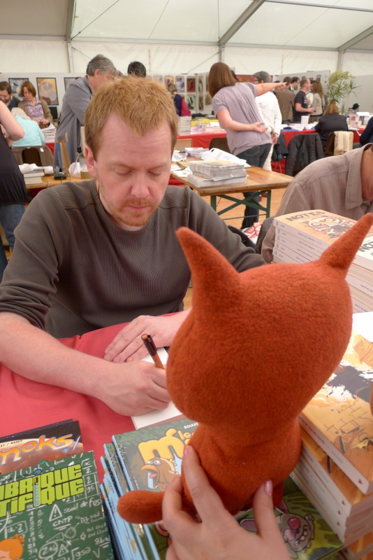 – Les deux dédicaces que Boulet nous a faites sur les tomes 4 et 5 de nos Notes. Sans crayonné préalable et en partant d’un détail autour duquel il construit son dessin au lieu de poser d’abord les volumes. Impressionnant. Et il se souvenait avoir déjà rencontré Régis 🙂 (Par contre, Fun’, je tiens de source sûre que tu es à peu près la 15694ème fille à l’envisager comme l’homme de ta vie. Je crains que ça ne soit pas gagné d’avance, cette histoire.)