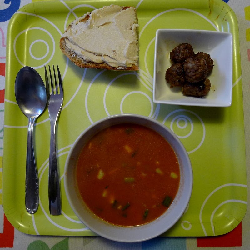 Présentée ici avec une tartine d’hoummous sur du pain aux céréales, et des boulettes kefta de chez Picard, cette petite soupe nous a régalés ce soir pendant que nous regardions le 3ème épisode de la saison 1 de « Glee ».