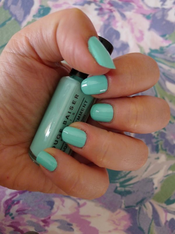 Pour commencer, deux couches de Vert Givré de Rouge Baiser. C’est le deuxième vernis de cette marque que je teste, et j’en suis aussi ravie que du premier. Ni trop liquide ni trop épais, il a une bonne couvrance, et le Corail Ardent avait tenu 5 jours sans une écaille. Le pinceau est trop fin pour faire tout l’ongle d’un coup, mais je n’y arrive jamais même avec les pinceaux OPI de toute façon. Bon, après, il faut aimer la couleur, mais personnellement je suis fan.
