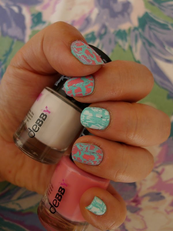 Et là, je me suis amusée avec les deux vernis crack Debby achetés hier: le rose et le blanc. Je sais, mes cuticules sont dans un état épouvantable (semaine de stress oblige), et faute de stylo correcteur ou de maîtrise de Photoshop, les finitions font limite peur. Mais j’adôôôre le craquelage de ce top coat, plus « aléatoire » que celui du Shatter OPI. Et les couleurs sont suffisamment soft pour éviter le côté punk du noir, peut-être un peu difficile à porter.