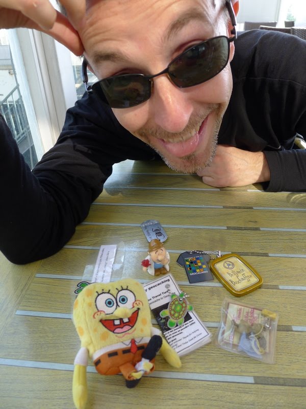 L’autre cache marquante fut le Train TB Hotel, vieux wagon de chemin de fer restauré situé sur le bord du fleuve. Il était censé abriter une cache de taille 3, très rare en milieu urbain. Nous avons cherché un bon moment. J’ai commencé par grimper à la petite échelle malgré mon vertige pour regarder si la boîte ne se trouvait pas au sommet du wagon. Un premier examen du dessous du wagon n’a rien donné. Nous sommes alors montés sur la passerelle qui surplombait le wagon. Après avoir fait chou blanc, nous sommes redescendus. Philou s’est glissé accroupi sous le wagon: toujours rien. C’est finalement Chouchou qui a repéré un véritable mini-coffre fort en métal vert camouflage, solidement attaché au wagon de manière à ce qu’aucun indélicat ne l’emporte. Nous avons encore un peu galéré pour l’ouvrir, et c’était vraiment le coffre au trésor: pas moins de 5 Travels Bugs et autres Geocoins à l’intérieur. J’en ai confié un à Philou; je me chargerai de déposer les autres en Suisse fin juin si possible, histoire qu’ils voyagent un peu. C’est sans doute la plus chouette cache que nous ayons faite à ce jour. Grande était notre satisfaction.