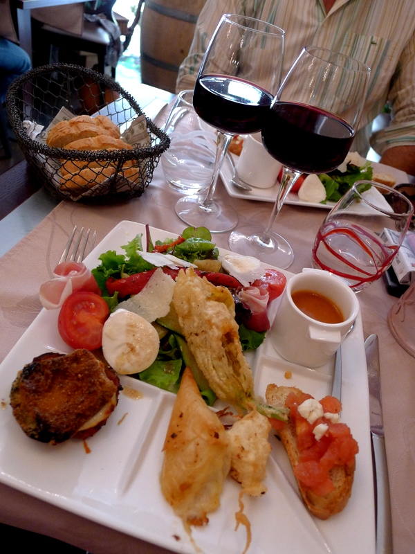 Ca faisait un petit moment déjà que plusieurs de mes amis me parlaient de Carré 2 Vigne, resto italien situé dans une petite rue face à l’Opéra de Toulon et tenu par le fils du propriétaire de La Théière. Je l’ai enfin testé hier midi avec Etre Exquis. Le menu proposait toutes sortes de piatti qui avaient l’air plus délicieux les uns que les autres, mais peut-être légèrement bourratifs par cette chaleur; du coup, nous avons tous les deux opté pour le plat du jour: une assiette d’antipasti accompagnée de gaspacho et de petits trucs panés. Je crois qu’Etre Exquis est resté un peu sur sa faim, mais pour moi, c’était parfait au niveau quantité, et ça m’a permis de commander un dessert la conscience et l’estomac légers. Mon clafoutis à l’abricot flanqué de sa glace maison assortie était divin. Face à moi, Etre Exquis souriait de bonheur en savourant un fondant au chocolat au coeur de coulis de fraise. Le Côte de Provence rouge dont on nous a servi deux verres était très correct lui aussi. Service souriant et assez rapide (mais nous sommes arrivés à 13h30, après le coup de feu, donc il ne restait guère de clients à servir en même temps que nous), et addition de 60€. Même si la déco moderne dans les tons turquoise et chocolat n’est pas forcément ma tasse de thé, je reviendrai volontiers déjeuner ici à l’occasion.
