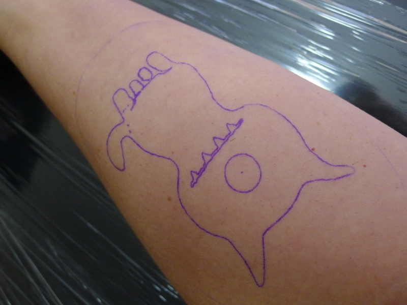 Olivier a commencé par me poser sur le bras une sorte de décalcomanie réalisé à partir de son dessin, et qui lui servirait pour tracer les contours de Régis sans se tromper ou faire d’erreurs de proportions.