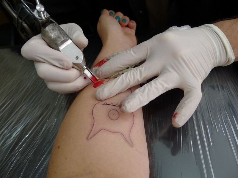 Sur la photo ci-dessus, on voit bien que la peau réagit au traumatisme des piqûres répétées en rougissant et en gonflant. Par ailleurs, le pistolet dépose autant, sinon plus d’encre en surface qu’à l’intérieur; le tatoueur doit donc essuyer régulièrement la zone pour continuer à voir ce qu’il fait.