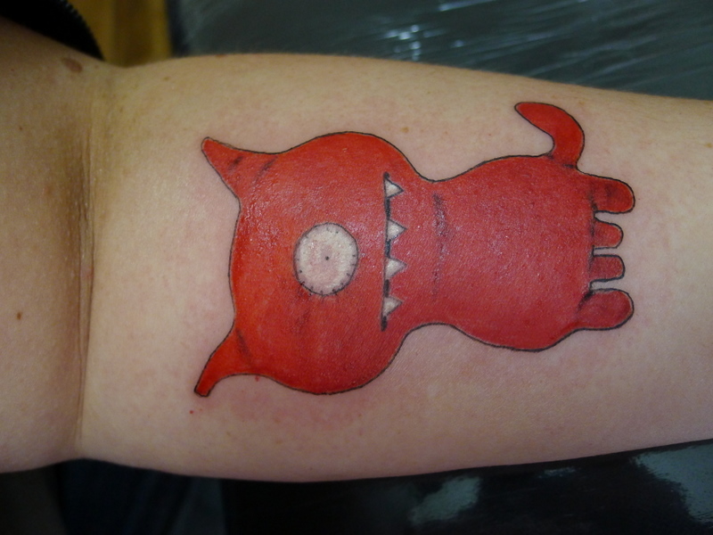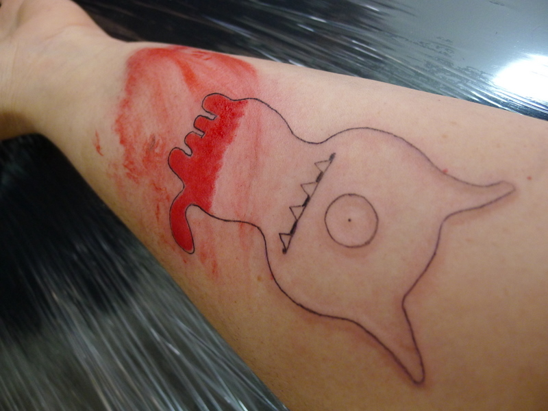 Ta-taaaaaam! Voilà Régis. Le résultat définitif ne se verra que dans quelques jours, le temps que ma peau absorbe bien l’encre et commence à cicatriser. En attendant, je dois éviter de m’exposer au soleil, de gratter la croûte même si ça me démange et de frotter mon tatouage (surtout contre des tissus synthétiques). Et je dois bien sûr l’enduire religieusement de Bépanthol trois fois par jour.