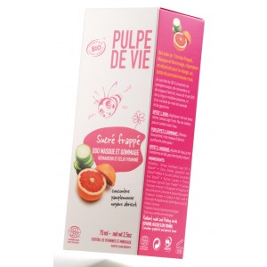 Lors de ma dernière virée à Paris, comme je passais au Naf-Naf des Champs-Elysées pour acheter quelques tops en soldes, je suis tombée en arrêt devant une étagère « cadeaux » dont tout le contenu était à -50%. Dans le tas, il y avait plein de boîtes à fortunes comme celle que j’avais acheté pour ma swapée un mois plus tôt (ça m’apprendra à me précipiter…), des carnets à fleurs PipStudio, des petits thermos signés Shinzi Katoh et… plusieurs produits de beauté Pulpe de Vie, une marque que je ne connaissais pas. Le joli packaging, allié à la certification bio et aux parfums pile poil dans mes goûts, m’a poussée à en embarquer un au hasard: le duo masque et gommage, donc.