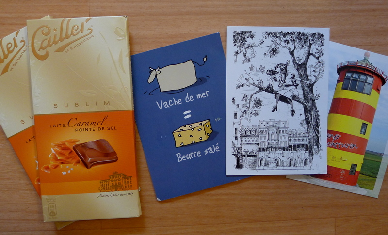 Deux tablettes de mon chocolat gruyérois préféré envoyé par Lady Pops avec un gentil petit mot et les deux paires de chaussettes oubliées chez elle en juin, plus deux chouettes cartes de Postcrossing en provenance de l’Allemagne et de l’Ukraine, et une autre très rigolote envoyée par la gagnante du concours zombie feltie. J’ai toujours l’impression d’avoir 90 ans dans mon corps, mais mon petit coeur est tout gonflé de joie par ces gentilles attentions. Je ne dirai jamais assez combien j’adore recevoir des surprises par la Poste, et combien j’aime encore plus que les gens pensent à moi. Merci infiniment, les filles!