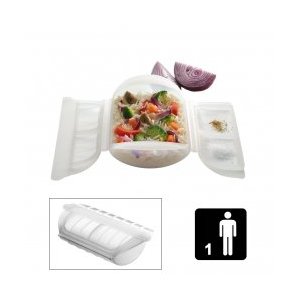 Il était consacré à la marque espagnole Lékué, qui fabrique de coffrets vapeur en silicone utilisables soit au micro-ondes, soit au four traditionnel pour une cuisson sans matières grasses qui préserve à la fois les vitamines et le goût des aliments. Or, Chouchou et moi cherchons sans cesse des moyens de nous nourrir plus sainement mais sans trop nous prendre la tête. J’ai donc embarqué le modèle 1 personne, pour tester (il ne restait pas de modèle 2 personnes, et à 48€, le modèle 3-4 personnes représentait un investissement que je n’étais pas sûre de vouloir faire en cette période de vaches maigres).