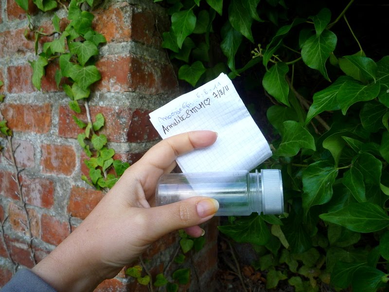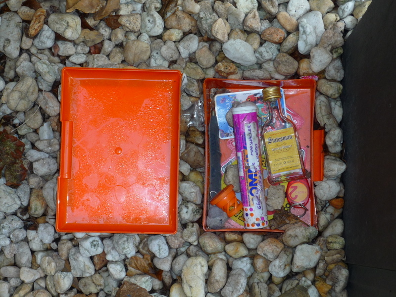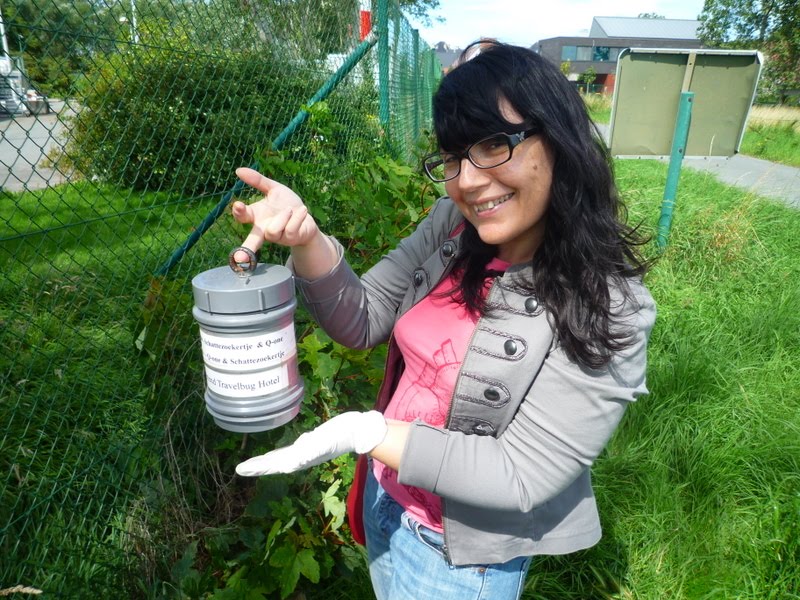 Bien qu’ayant l’estomac dans les talons, nous décidons de faire encore la « Ostende Travel Bug Hotel » qui se trouve quelques centaines de mètres plus loin, au bord d’une petite route de campagne. Notre GPS ne nous donne que des indications imprécises; je me pique sur des orties en retournant toutes les pierres des environs. Une cache de taille 3 enfoncée dans le sol, ça ne peut quand même pas passer inaperçu? C’est finalement le smartphone de Chouchou qui nous guide jusqu’aux bonnes coordonnées, où je repère assez vite un couvercle orangé dissimulé sous l’herbe haute un peu couchée en bordure d’un grillage. La cache est très belle, très bien foutue et extrêmement étanche. Elle contient tout plein de petits trésors parmi lesquels je choisis un fantôme phosphorescent et un Travel Bug auquel est attaché un mini-pull tricoté. En échange, je dépose un nain de Blanche-Neige et le Travel Bug Bob l’Eponge que je traîne depuis le Travel Bug Hotel d’Anvers tellement il est énorme.