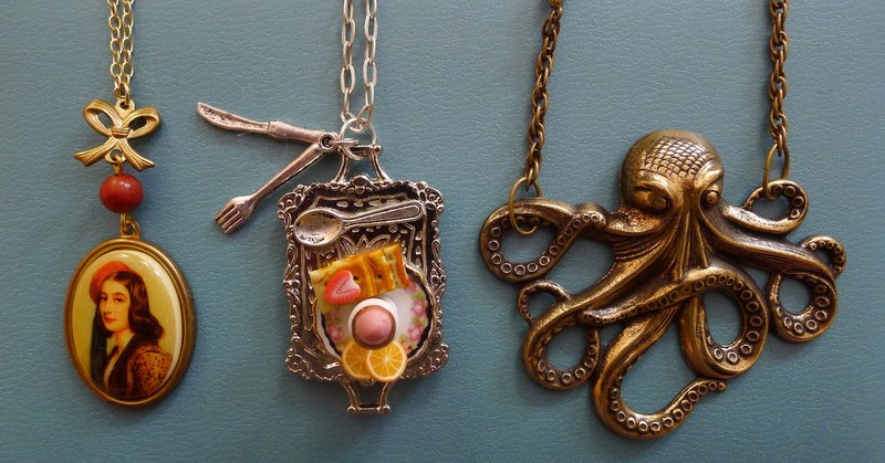 Pendant que j’y suis, saviez-vous que La Princesse, Française expatriée en Belgique par amour pour un autochtone – tss tss, quel manque d’originalité! – fabrique des bijoux basés sur des concepts totalement tordus bien sympathiques? L’autre jour, je me suis rendu compte que je la connaissais depuis moins de deux ans et que j’avais déjà fait l’acquisition, d’une façon ou d’une autre, de 7 de ses colliers. Admirez donc: