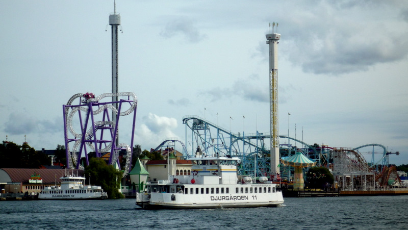 Longeant le bord de l’eau, nous sommes arrivés à l’embarcadère du ferry qui, en été, relie Skeppsholmen à l’île voisine de Djurgarden où nous voulions nous rendre ensuite. Par chance, les liaisons se poursuivaient jusqu’au week-end suivant. Au lieu de remonter jusqu’en centre-ville afin de prendre un tram pour redescendre cent mètres plus loin, nous en avons donc été quittes pour attendre une petite demi-heure et franchir le bras de mer en moins de trois minutes. C’est ainsi que nous avons débarqué sur « l’île aux divertissements »… La suite plus tard, je me rends compte que ce post est déjà bien long!