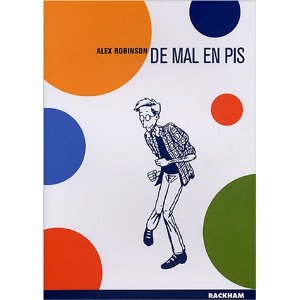 « De mal en pis », c’est un énorme pavé d’Alex Robinson. 600 pages de tranches de vie d’une longueur variable, entrecoupées d’interludes durant lesquels chacun des personnages répond à une question telle que « Avec qui aimeriez-vous bruncher? », « Quel est l’endroit le plus insolite où vous ayez fait l’amour? » ou « Si vous pouviez changer un détail de votre apparence, lequel choisiriez-vous? ». L’auteur est extrêmement doué pour nous faire entrer dans la tête de ses personnages et susciter une forte empathie vis-à-vis d’eux, y compris lorsqu’ils sont odieux. Il retranscrit très bien les doutes et les hésitations qui accompagnent la naissance d’une relation amoureuse, et j’ai souvent eu le coeur serré par les passages les plus durs de son roman graphique. Un conseil: si vous lisez « De mal en pis », faites bien attention aux petits détails qui paraissent sans importance sur le coup, car ils en prendront une plus tard. Ainsi, cette jeune fugueuse qui apparaît de loin en loin sans qu’on sache trop ce qu’elle fait là, et qui connaîtra une fin particulièrement tragique, s’avère au final avoir un lien très important avec l’un des personnages principaux. Je pourrais encore vous vanter la beauté des dessins en noir et blanc d’Alex Robinson et son sens merveilleux de la composition, ou la virtuosité avec laquelle il joue sur toute la gamme des sentiments humains; je pourrais aussi faire valoir la qualité de la traduction de Sidonie Van den Dries, mais je craindrais de retarder le moment où les amateurs de bédé parmi vous fonceront chez leur dealer local ou se connecteront à Amazon pour commander « De mal en pis« . Vous aurez rarement aussi bien investi une petite trentaine d’euros.