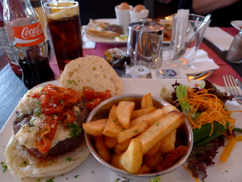 Chouchou a opté pour le breakfast, comprenant une boisson chaude (et malheureusement, en guise de thé, il a vu arriver un vilain sachet de Lipton jaune), un jus de fruits frais pressé, des oeufs (au choix: sur le plat, à la coque, brouillés ou en omelette), un mini-burger, une saucisse, du bacon et des tomates-mozza, le tout pour 13€. Le reste d’entre nous a préféré choisir des burgers: classique pour La Princesse et auvergnat (au camembert) pour Son Consort; quant à moi, de façon assez prévisible, j’ai craqué pour le blue au fromage bleu et aux tomates séchées. Pour une fois, j’ai eu la bonne surprise de recevoir un steak très épais, tendre et réellement saignant comme je l’avais demandé. Halléluiah!* Bonne quantité de fromage et tomates délicieuses; frites rectangulaires pas exagérément cuites; pincée anecdotique de salade verte et de carottes râpées. A 15,50€, c’est plutôt honnête. J’ai juste regretté que la carte ne propose pas de recette vraiment originale. Et j’ai bien fait de ne pas me réserver pour le dessert, parce qu’il n’y avait qu’un gâteau au chocolat ou des glaces.