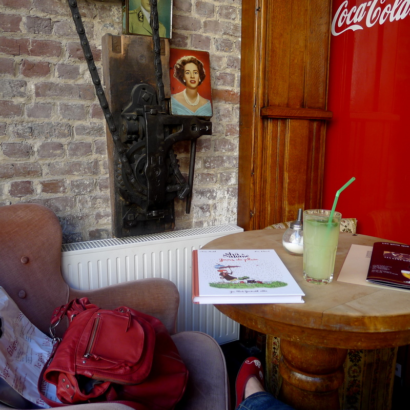 Brunch au BlaBla & Gallery, donc. Par ce beau soleil, tout Bruxelles se baladait dans les Marolles, où les places de parking étaient encore plus rares que d’habitude. Par contre, il n’y avait pas grand-monde au resto. Une bonne partie de la discussion a tourné autour du chat de Schrödinger: pourquoi sacrifier un chat plutôt qu’un Pékinois, une fouine ou Tom Cruise, et ne serait-il pas judicieux, si je me retrouvais célibataire et contrainte de recourir au speed dating, de commencer à filtrer les candidats en leur demandant ce que prouve cette expérience. C’était assez rigolo. Chouchou et moi avons ensuite abandonné Gianluca pour aller faire un tour au Brussels Vintage Market, qui a définitivement entériné mon opinion sur les vêtements de friperie: je ne trouve pas ça cool et unique; je trouve que ça sent la penderie de grand-mère, et les imprimés me font mal aux yeux. Nous sommes entrés et ressortis aussi sec pour rentrer à la maison. J’aurais bien traîné encore dehors pour profiter du beau temps, mais j’avais à faire chez nous!