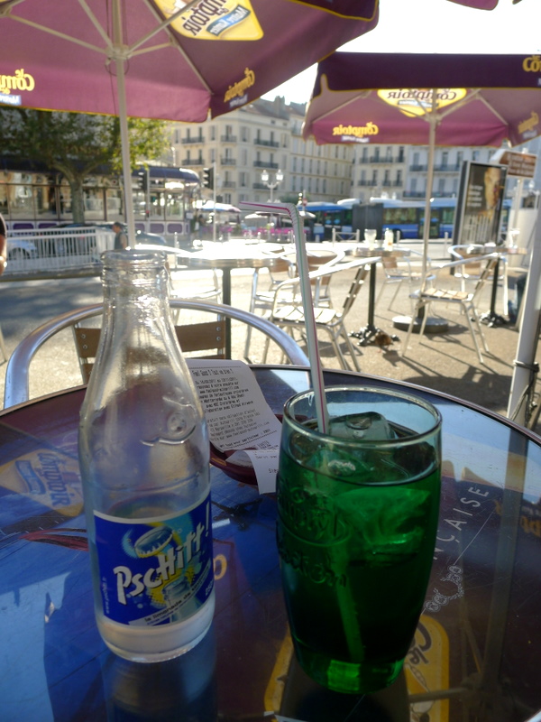 J’ai déjà ôté le bonnet que je portais ce matin pour me protéger de la drache bruxelloise, et mon blouson en cuir doublé n’est plus qu’un poids mort qui m’encombre. A la descente du train, le soleil m’éblouit, et je commence aussitôt à transpirer dans mon pull fin. Je me dépêche d’aller m’attabler à la brasserie voisine, où je commande un diabolo menthe.