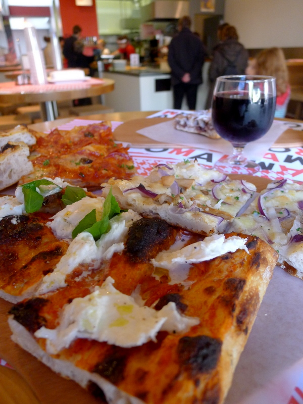Lundi, nous avions opté pour une mozzarrella-basilic, une cèpes-oignons rouges, une patate à l’huile de truffe et une salami piquant. Parmi les autres recettes que j’adore, il y a une lard-crème de potiron, et puis des pizzas avec de la courgette, de l’aubergine ou de la crème d’artichaut. Sans compter la pizza sucrée au chocolat, dont je me méfiais au premier abord mais qui fait un goûter assez savoureux. Les amateurs de pâte fine feront bien de passer leur tour: ici, la pâte est épaisse, moelleuse et sans doute pleine d’huile d’olive – tout ce que j’adore. Et les garnitures sont toujours d’une qualité irréprochable, qu’il s’agisse de la charcuterie (variée et succulente) ou des légumes. En fait, la seule chose que je déplore chez Mamma Roma, c’est l’attente. Les Bruxellois connaissent ces bonnes adresses, et aux heures des repas, la file est toujours très longue. Mais franchement, des pizzas pareilles valent bien un peu de patience…