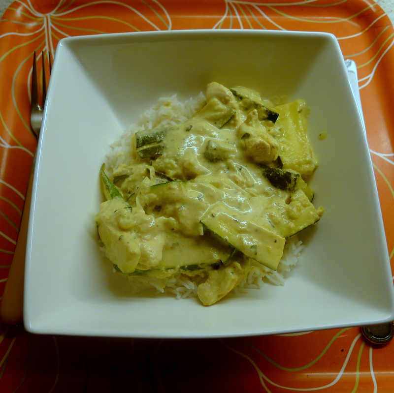 Puisque je me vantais récemment d’être la reine des improvisations avec des fonds de placard, je vous livre ici celle qui a eu le plus de succès à la maison. Ce soir-là, il me restait une brique de lait de coco entamée, une courgette qui dépérissait dans le bac à légumes et deux filets de poulet congelé… Nous avons tellement aimé le résultat que depuis, je refais régulièrement ce plat. Vous me pardonnerez les proportions approximatives, puisque du coup je ne mesure pas mes ingrédients.
