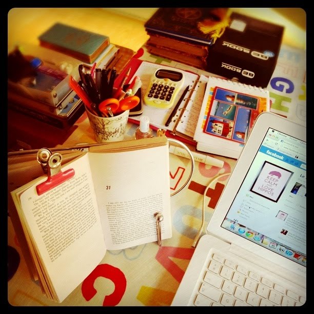 Voilà le coin de table où je bosse tous les jours quand je suis à Bruxelles. D’habitude, il n’est pas aussi encombré; il faut vraiment que je range un peu!