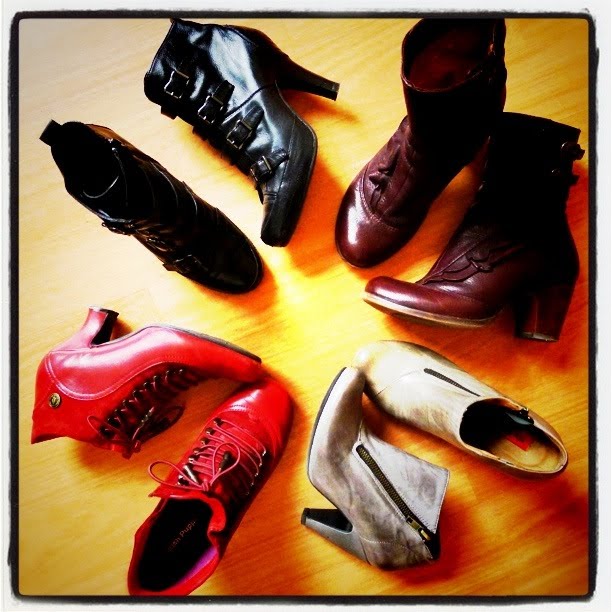 J’aurais aimé faire plus original, mais l’occasion ne s’est pas présentée. Les bottines rouges sont des Hush Puppies, les noires des Ash, les marron des Chie Mihara et les gris clair des Miz Mooz. Je vous ai épargné mes boots de moto Free Lance (achetés en 2004 et toujours increvables, alors que c’est la paire de chaussures que j’ai le plus portée de toute ma vie), mes camarguaises en croûte de porc camel dégotées en soldes chez André pour 29€ et mes Ugg grises que j’adore pour leur confort mais dont je reconnais volontiers la hideur.