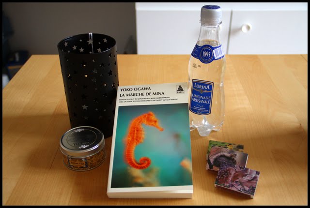 J’avoue avoir eu un bref moment d’inquiétude en entendant mon colis émettre des « gloup-gloup-gloup » alors que je le déballais ^^° Cinq paquets se nichaient à l’intérieur, j’ai commencé par le livre, La marche de Mina de Yoko Ogawa. Nuryko tombe très bien, à force d’entendre parler de cette auteur, j’envisageais d’acheter un de ses romans : ) L’accompagnaient trois boîtes d’allumettes, une petite bouteille de limonade artisanale et un ravissant photophore à étoiles, tous trois choisis en lien avec le livre. En bonus, une petite boîte de thé « Kashmir Tchaï », déjà testé et largement approuvé en mousseline mais que je n’avais pas chez moi. Je m’en ferai une tasse pour accompagner ma lecture : )